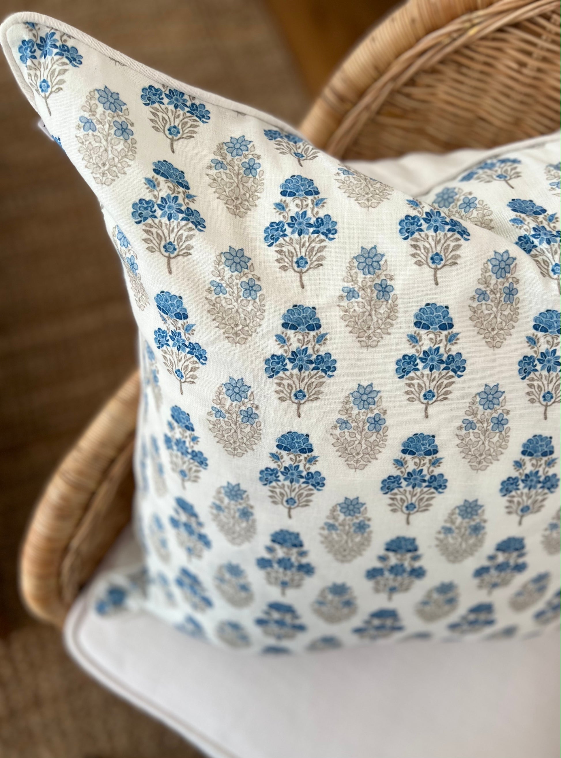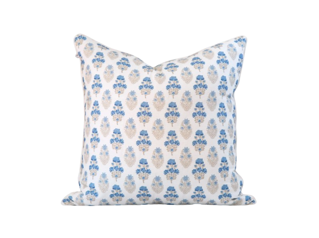 Introducing Vivienne Mughal Block Print Pillow Cover from Tajik Home. Inspired by vintage Indian designs, this meticulously crafted piece seamlessly blends traditional elegance with modern flair. Each intricate detail is carefully curated, drawing from historic art found in old wallpaper books, vintage homes, and antique marketplaces. Tajik Home has infused vibrant, modern colors to breathe new life into classic patterns, ensuring a perfect blend of timeless charm and contemporary style. Featuring a captivating blue and white floral print, it evokes serene coastal vibes and effortlessly complements our coastal collection. Its versatile design allows for effortless mixing, matching, and layering with other pillows from our collection, empowering you to create your own unique aesthetic with ease.