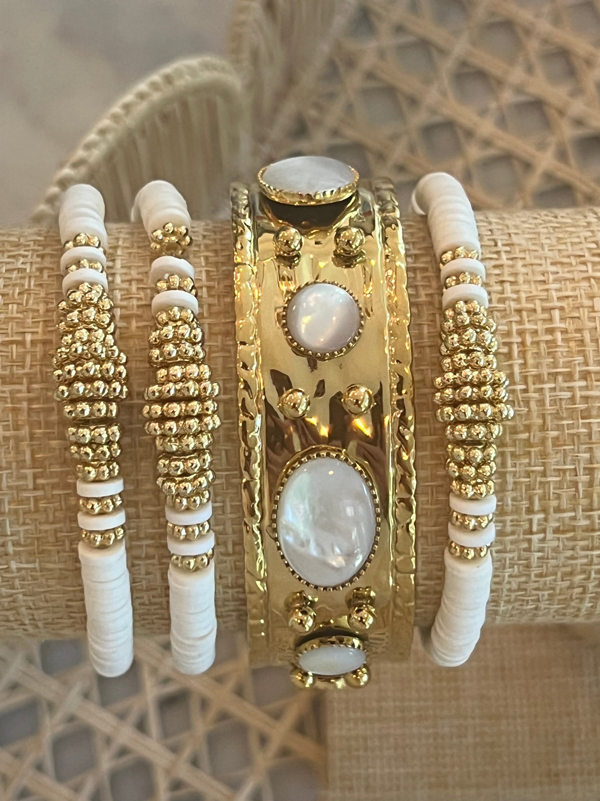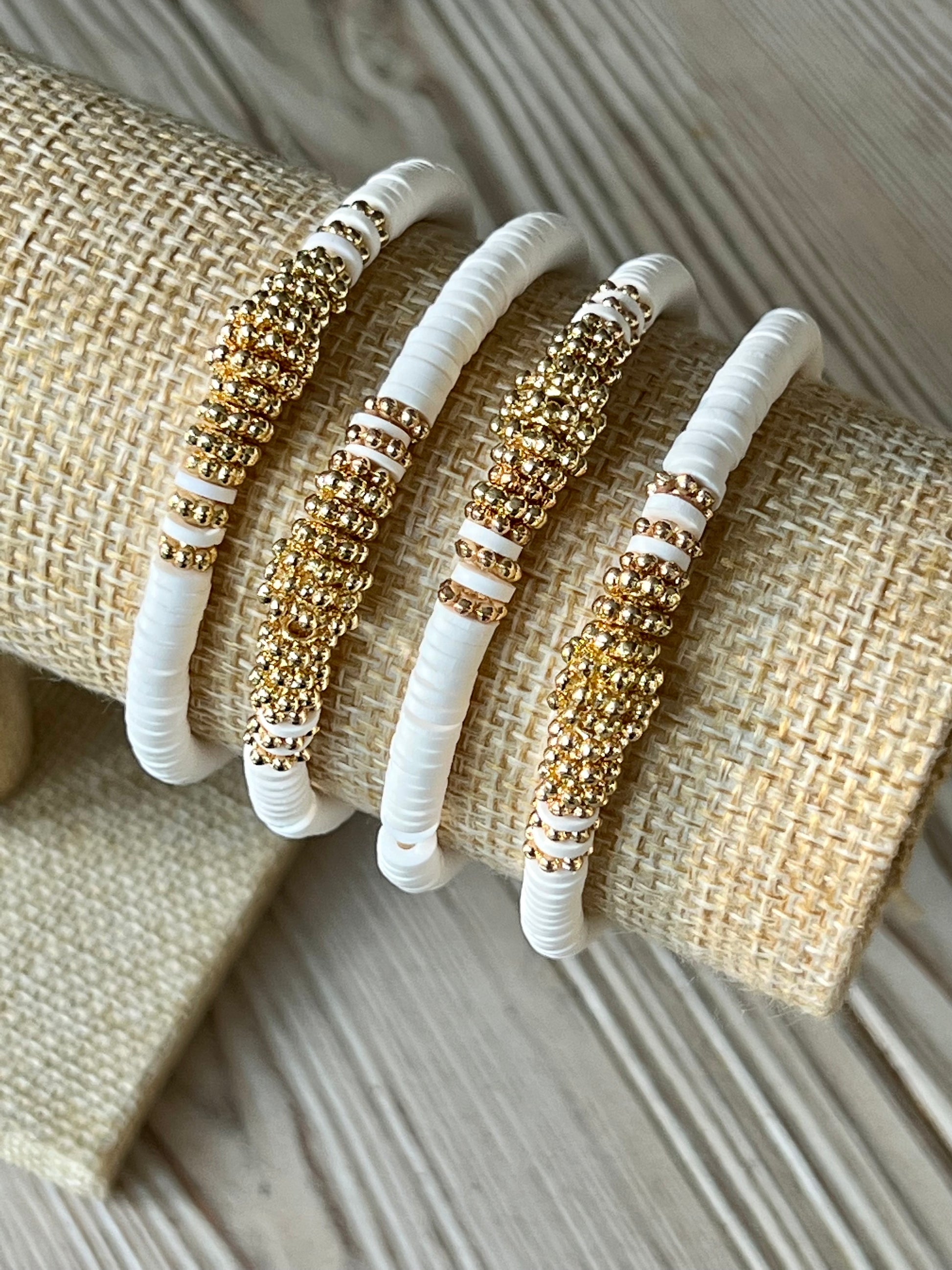 This fashionable bracelet with white and golden brass beads mirrors the Parisian 'je ne sais quoi'. Its components include Polymer grey Heishi beads and fine gold-plated brass, provided in an elastic size. To guarantee longevity, it is recommended to keep this piece away from liquids and fragrances.