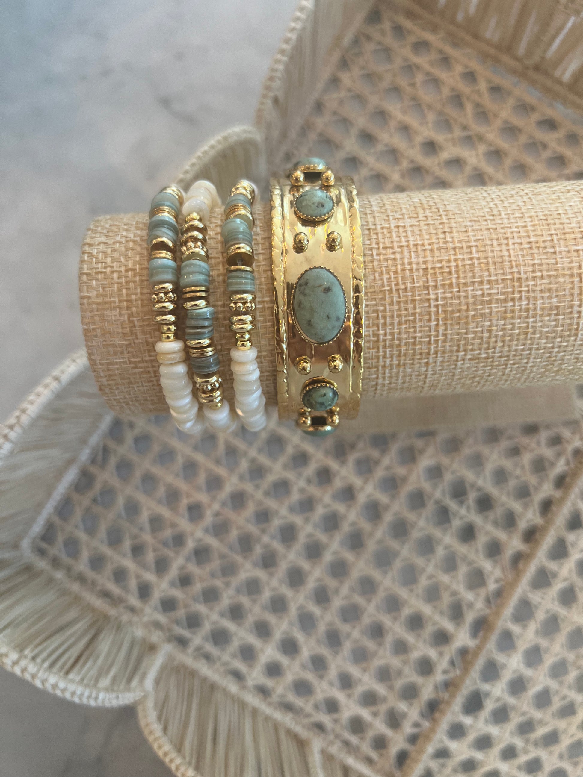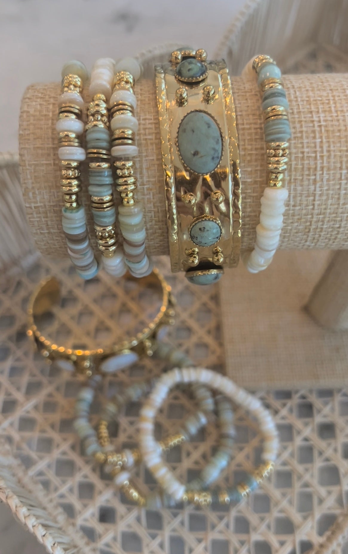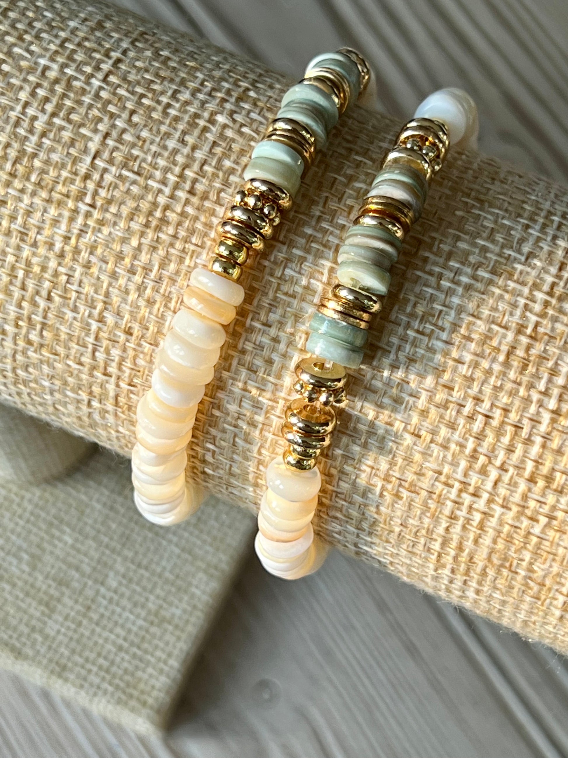 Composition: Polymer heishi pearls, tinted white and green mother-of-pearl and golden rings in 1 micron gold plated.