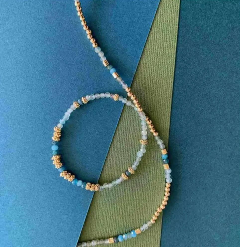 Gemstone necklace: blue and green apatites pearls gilded with 24 carat fine gold.